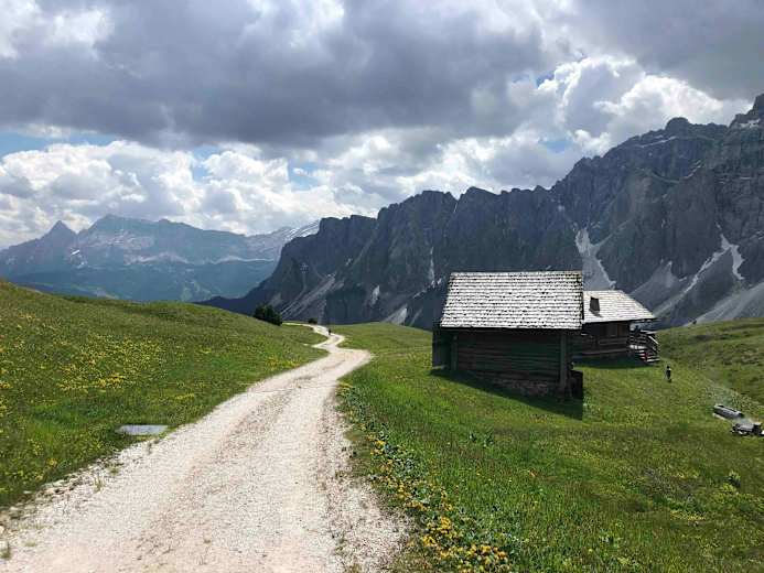Am hinteren Ende des Ortes Lungiarü nimmt man den Forstweg Nr. 5, der taleinwärts führt. Der Weg ist breit und nicht allzu steil, das Bergpanorama dafür schon am Beginn fantastisch. Während der Wanderweg Nr. 5 schon bald rechts abzweigt, bleibt man auf dem Forstweg - nun 5A - und folgt den Kehren aufwärts, bis man die Ütia Ciampcios auf 2.025 m inmitten blühender Bergwiesen erreicht.