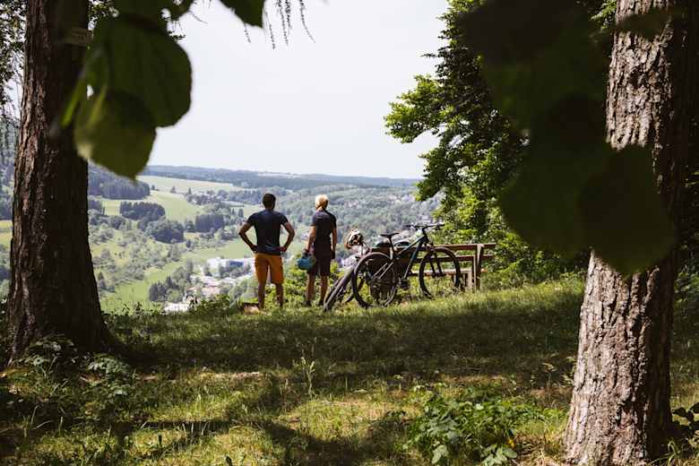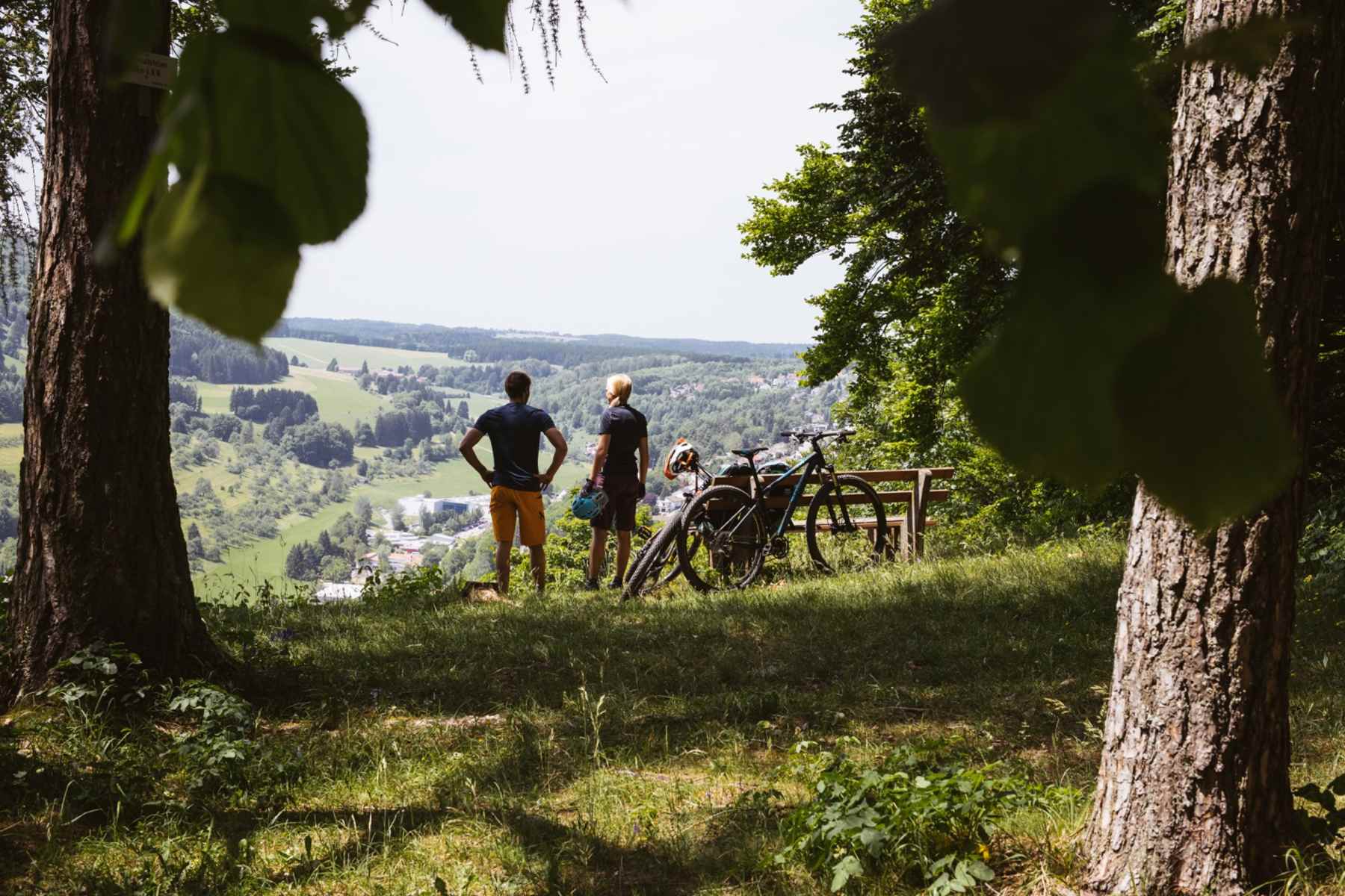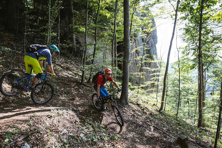 Vom Startpunkt am Waldheim in Albstadt-Ebingen fahren wir zunächst einige Meter auf einem geteerten Weg, der auch von Wanderern benutzt wird, in Richtung Schlossfelsenturm. Der unverwechselbare Panoramablick vom Schlossfelsen samt Turm ist alle Male einen Abstecher wert und kann durch Folgen der gelben Wanderbeschilderung erreicht werden. Wer ohne Umwege vorankommen möchte, zweigt noch vor dem Aussichtspunkt an der Kuppe rechts in den Downhill Schlossfelsen ein und rollt auf dem ersten kurvenreichen Trail-Abschnitt, der bei der Bewältigung der Spitzkehren auch Technik abverlangt, spaßig in Richtung Tal. Achtung eine Straße quert! (Fahrtechnische Schwierigkeit: S2).