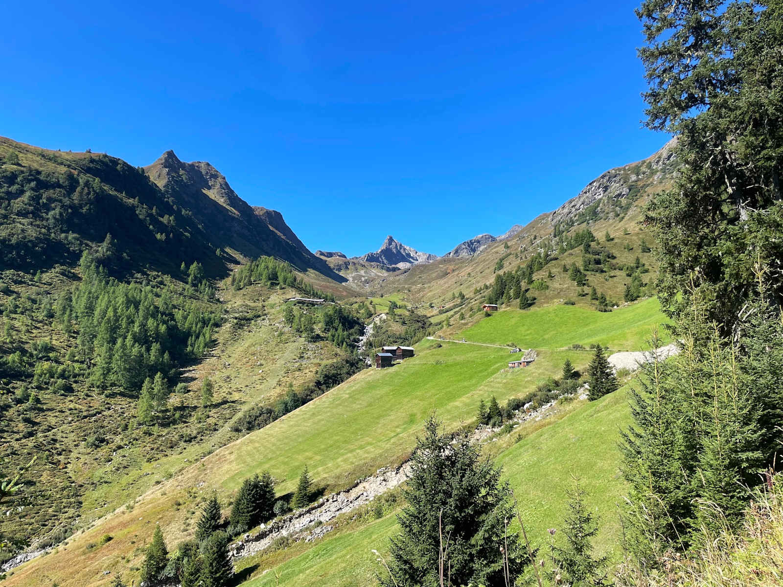 In einem sehr spitzen Abzweig geht es anfänglich noch auf Asphalt, dann auf einem breiten Forstweg immer gut beschildert zur Niederelbehütte. Unterhalb des Alpengasthof Dias ist nochmals eine Abzweigung – hier wie beschildert Richtung Seßladape fahren. Hier öffnet sich das Tal und ganz oben sieht man schon die Hütte unterhalb der Kreuzjochspitze thronen.
