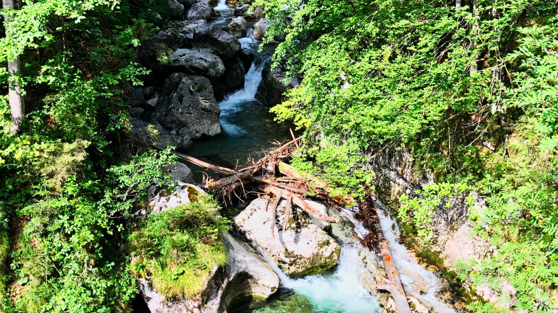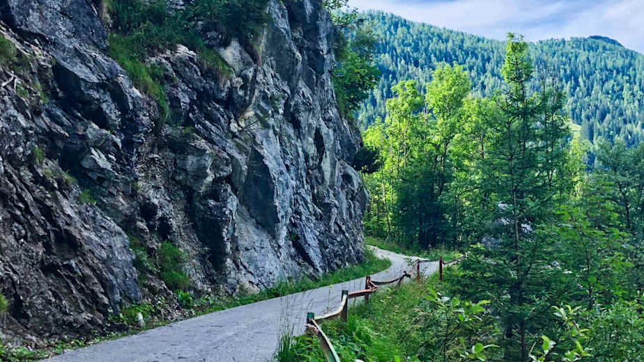 Die alte Postalmstraße ist geschichtsträchtig und seit langem für den öffentlichen Verkehr gesperrt. Die Reise geht weiter über Brücken und Schluchten entlang des Aubachs. Nach rund 6,2 km kommt man an eine Kreuzung (758 hm, km 28,5), welche man geradeaus passiert. Nach rund 3,7 km quert man den Aubach, eine kurze Erfrischung in den Felsenbecken unter der Brücke und weiter gehts bis man nach 1,5 km aus dem Wald kommt und rechterhand ein altes Holzhaus steht. An dieser Kreuzung fährt man weiter geradeaus auf Asphalt bis Pichl. Von hier hat man wieder einen Blick auf den Dachstein, welcher bis zum Ende der heutigen Tour begleiten wird.