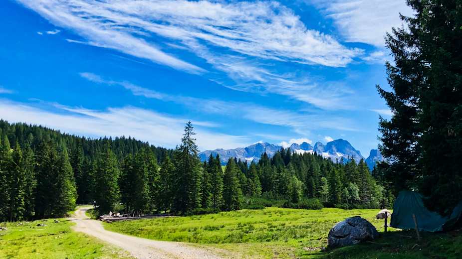 Der Weg führt weiter bergab nach links in Richtung Paß Gschütt, den man nach 4,7 km erreicht. Am Weg gibt es den einen oder anderen Blick auf das Gosautal, den Dachstein und auf die morgige Etappe über die Durchgangalm. Man quert die B166 nach rechts unten, um nach wenigen Metern links abbiegend (895 hm, km 62,9) die Schotterstraße durch den Rinnwandgraben in Richtung Gosau zu nehmen.