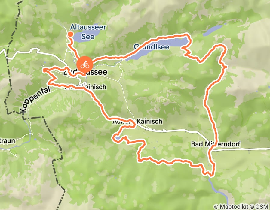 Geradeaus führt uns der Weg weiter bis man aus dem Wald kommt und kurz darauf auf der linken Seite ein Gehöft passiert (746 hm, km 5,5). Am Stapflweg geradeaus biegt man in die Sarsteinstraße rechts ein (706 hm, km 6,1), um diese nach rund 900 m links nach dem Gebäude (694 hm, km 6,9) in den urigen Austegweg zu verlassen. Der Austegweg ist ein einfacher Trail, welcher kurz darauf etwas breiter wird und nach rund 1 km über die Koppentraun führt. Flußaufwärts entlang der Koppentraun gelangt man in die Koppentalstraße und erreicht nach rund 1,9 km den Bahnhof Bad Aussee. Geradeaus weiter über die Kainischtraun biegt man bei erster Gelegenheit rechts (641 hm, km 10,2) in die Sießreithstraße, der man 1 km folgt. Bevor man die B145 erreicht, biegt man rechts über die Kainischtraun, um nach der Brücke links dem Radweg an der Koppenalmstraße zu folgen. Nach 1,3 km geht's wieder in einem links-rechts Haken (681 hm, km 12,5) über den Fluss und weiter dem Radweg flussaufwärts in Richtung Bad Mitterndorf.
