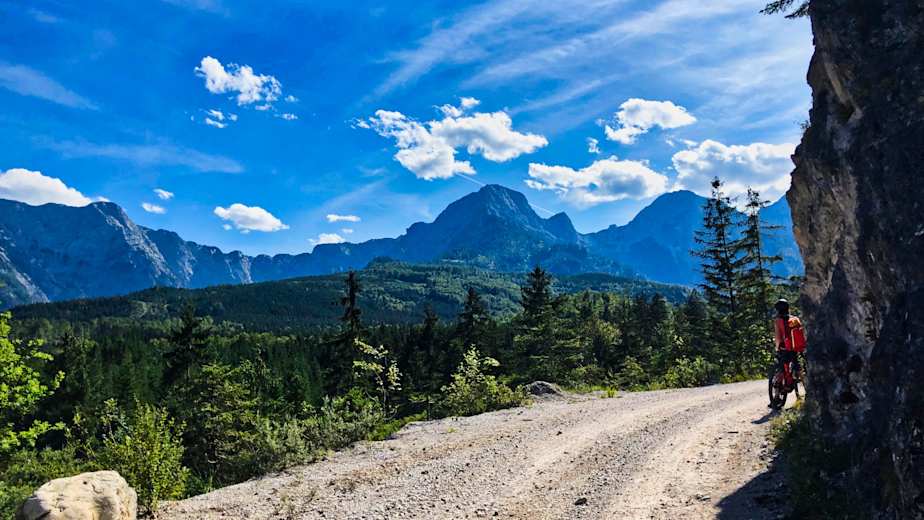Die Originalroute führt nochmals ca. 700 m bergauf durch den Rumitzgraben, links unterhalb des Hochlacken geht die Route rund um den Fahrnaugupf mit wunderbaren Ausblicken über den Traunsee. Nach etwa 13,7 km besteht die Möglichkeit auf einen Einkehrschwung auf der Hochsteinalm, ansonsten geht's weiter bis zur nächsten Kreuzung. Nach rund 100 m, die man gerade bergauf quert, um nach 1,9 km die Forststraße steil nach links oben auf einem Uphill Trail (861 hm, km 54,3, Schiebehilfe benützen) zu verlassen. Dieser Abschnitt ist deutlich einfacher als am Offensee und auch deutlich kürzer. Wer kann, fährt die 200 m und 55 hm bergauf, um oben angelangt den Pfad nach links unten zu wählen, welcher nach 700 m wieder nach rechts in die Forststraße einmündet.