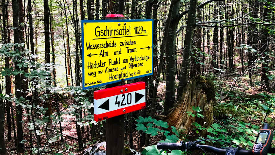 Die Etappe BergeSeen 9 startet beim Tourismusbüro in Grünau. Man fährt erstmal dem Radweg folgend in Richtung Almsee, den man nach rund 11,2 km erreicht. Dort biegt der Weg (S800) auf 589 m Seehöhe vor dem See und vor der Brücke rechts ab. Vorerst geht es gemütlich auf Schotter leicht bergauf, doch bereits nach wenigen Kilometern steigt der Weg stetig an in Richtung Offensee. Man folgt der Markierung S800 BergeSeen 9 und erreicht nach rund 9,4 km die Abzweigung, welche in einer Linkskurve als Naturweg nach rechts oben auf den Gschirrsattel führt. Der Weg wird laufend enger und nach wenigen Metern erreicht man den höchsten Punkt der Tour auf 1.031 m.