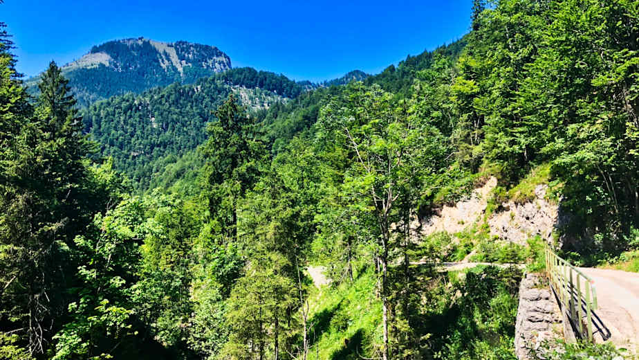 Der Shared Trail führt jetzt in Kurven und steilen Absätzen rund 900 m nach oben (847 hm, km 28,6) mündet dort in die Forststraße nach rechts. Man folgt dieser vorbei an schönen Forsthäusern immer bergab bis Rindbach. Nach rund 5,1 km bietet sich nach einer Rechtskurve (542 hm, km 33,7) ein Panoramablick über das Rindbachtal bis Ebensee.