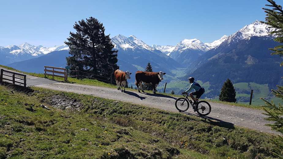 Gelegentlich trifft man auf dem Weg zur Hörgeralm auch Kühe, die hier ihren Almsommer genießen. Foto: Mittersill Plus Tourismus Bildergalerie (3)