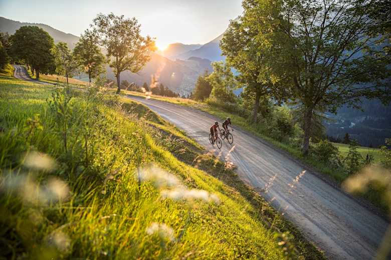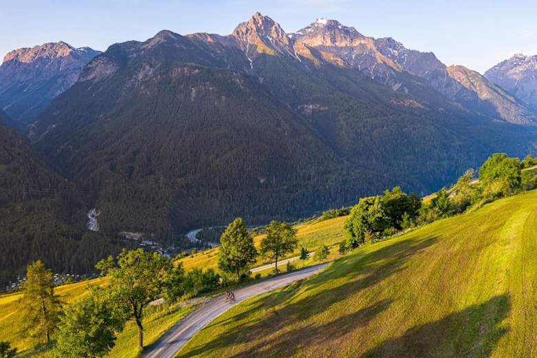 Sie starten die Gravelbike-Tour im sonnenverwöhnten Scuol (1.243 m ü. M.). Der Strasse entlang geht es direkt mit einer Steigung in Richtung des benachbarten Bergdorfes Sent (1.430 m ü. M.) los. Das Unterengadin ist inmitten imposanter Berge eingebettet und das Panorama auf dem Weg nach Sent ist besonders bei Morgenlicht unbeschreiblich.
