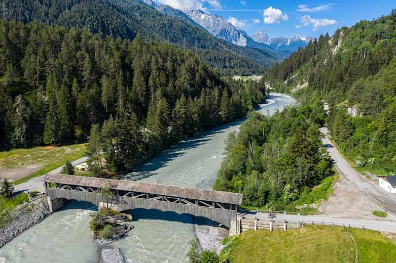 Talauswärts rollt es dann etwas einfacher. Zunächst dem Hang entlang ins Bergdorf Vnà (1.636 m ü. M.) und dann mehrheitlich bergab nach Ramosch (1.232 m ü. M.). Von Ramosch fahren Sie kurz auf der Strasse, bevor Sie links abbiegen in Richtung des Inn. Über eine Holzbrücke gelangen Sie zum Campingplatz, von wo aus Sie auf dem Inn-Radweg gemütlich dem Inn entlang zurück nach Scuol rollen.
