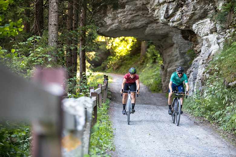 Nach einem gemächlichen Start in Brigels (1.284 m ü. M.) folgen schon bald einige schnelle Kurven. Dabei lohnt es sich, zwischendurch den Blick ins Tal schweifen zu lassen. Auf der Kiesstrasse in Richtung Waltensburg (1.002 m ü. M.) passieren Sie einen kurzen, aber imposanten Stein-Tunnel, der etwas Abenteuerfeeling aufkommen lässt.