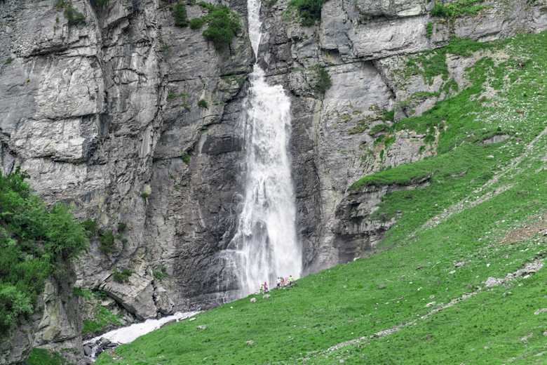 Die Felswand mit den imposanten Wasserfällen ganz hinten am Lag da Pigniu ist so beeindruckend, dass sich der Umweg bis ganz an das Ende der Kiesstrasse auf alle Fälle lohnt.