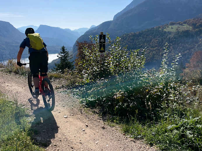Wunderschöne leichte Mountainbikerunde über dem Molvenosee in der Brenta, die mit einer leichten Trailabfahrt aufwarten kann. Ziel und höchster Punkt der Tour ist die Hütte La Montanara, von der aus man einen wunderbaren Ausblick auf die Adamello-Brenta Gruppe und den Cross dell'Altissimo hat.