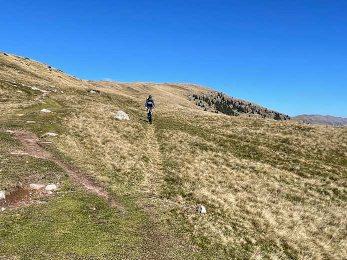 Am Kreuzjöchl verlässt man den Forstweg und schiebt sein Bike rechts einen Trail bergauf, der aufs Kreuzjoch (2.086 m) führt. Von hier beginnt ein Trail (S0, stellenweise S1) bergab in die nächste Scharte, dem Auener Jöchl.