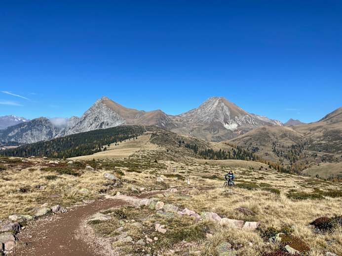 Genauso wie Aufstiegs-, gibt es auch mehrere Abfahrtsvarianten. Eine führt direkt über den Gipfel, auf der anderen Seite bergab zur Sattler Alm und der Leadner Alm nach Hafling und von hier zurück zur Seilbahn. Auf dieser Variante gibt es einige schöne Trails, die man sich mit Wanderern teilt.