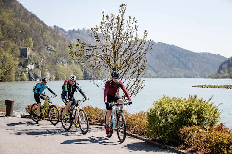 Das Obere Donautal ist mit über 90 km (!) eines der längsten Durchbruchstäler der Donau. In diesem tiefen Kerbtal befindet sich der Startpunkt – der Hafenort Untermühl. Heute unscheinbar, war dieser einst bedeutend: Versorgungsort für die Donauschifffahrt, Kettenturm (= Mautstation), Endpunkt des Schwarzenbergschen Schwemmkanals, ...! Zum Aufwärmen radeln Sie eben ins romantische Große Mühltal bis zum versteckt gelegenen Speicherkraftwerk Partenstein. Hier beginnt einzigartiges Flankensurfen durch wundervolle Hangschluchtwälder! Der erste Anstieg (180 Höhenmeter) führt über einen knackigen Wartungsfahrweg entlang der Druckleitungen des Kraftwerks auf das Hochplateau zum Bauernweiler Ramersberg. Gratulation! Temporeich sausen Sie auf einem steilen Waldweg zurück in die Tiefe des Großen Mühltals - zur Ebenmühle. Der zweite Anstieg (280 Höhenmeter) führt über einen teils knackigen historischen Fahrweg aufs gegenüberliegende Hochplateau. Oben radeln Sie erhaben durch welliges Bauernland nach Kirchberg ob der Donau zum imposanten Aussichtsturm „Donau am Berg“ (613 m). Gratulation – Halbzeit des Flankensurfens! Grandioser 360°-Panoramablick über das Mühlviertel, das Donautal, den Sauwald, ... bis hin zu den Alpen. Übrigens stehen Sie hier auf der höchsten Erhebung, die sich direkt aus dem Donaustrom erhebt. Flowig läuft das Bike kurz weiter bis zur Kante in die Donauschlucht, dann fordert die kernige Steilabfahrt durch die Donautalflanke auf teils trailartigen Waldwegen volle Konzentration. Für willkommene Regeneration sorgt entspanntes Flusscruisen entlang der Donau bis Obermühl an der Donau. Aufmerksamen Bikern wird dabei der Kontrast zwischen historischem Getreidespeicher am Ortsanfang und der zeitgenössischen Architektur des übrigen Dorfes ins Auge stechen. Der Grund: Der historische Ortskern versank in den Fluten des Donaustaus für das Kraftwerk Aschach. Bei der modernen „Gold“-Kirche startet der dritte Anstieg (260 Höhenmeter). Eine aufgelassene Steinstraße führt zünftig durch die steile Kleine Mühltalflanke – die alte Salzstraße. Einst wurde das Salz des legendären Salzkammerguts per Schiff nach Obermühl transportiert und Säumer brachten es nach Böhmen. Für Radphilosophen: „Heute sind unsere Trikots mit Salz getränkt“ ;-) Am Hochplateau ist mit dem Bauernweiler Untered der Wendepunkt erreicht. Gratulation! Kurz regeneratives Kulturradln und auf fordernden Fahrwegen die steile Talflanke zurück in die Tiefe des Kleinen Mühltals - zum Bruckwirt.