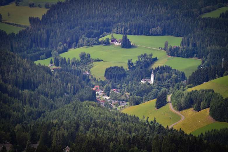 Man kommt wieder zurück in den Ortskern von Rettenegg und biegt nach dem Gasthaus Simml rechts in eine kleine Straße ein. Nach ca. 100 m biegt man wieder rechts ab und folgt dieser Straße bis nach Ratten. Bei der Kreuzung zur Mautstraße fährt man hinauf auf die Pretul. Vom Gipfel fährt man auf der Mautstraße wieder hinunter bis zur Jausenstation Eichtinger.