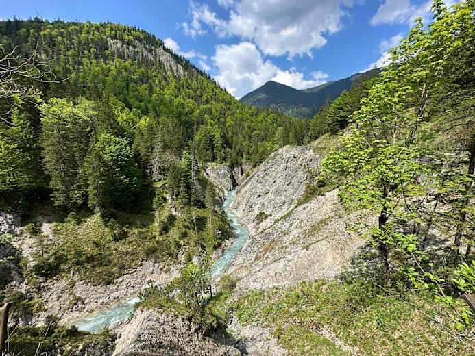Weiter geht es nun ca. 10 km bergab durch das Johannistal in Richtung Hinterriß. Dort, wo der Johannisbach auf den Rißbach trifft, beginnt die Asphaltstraße nach Hinterriß. Man passiert die Mautstelle und in Hinterriß gibt es nochmals eine Einkehrmöglichkeit, das Gasthof zur Post, gleich daneben das Karwendel Naturparkhaus.