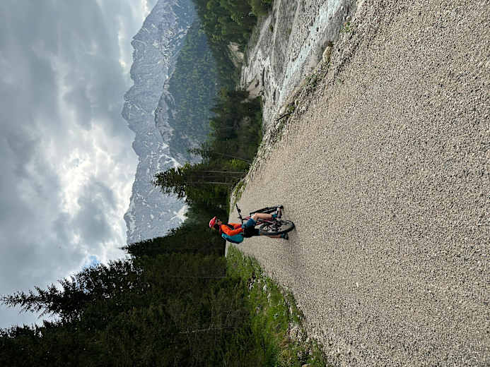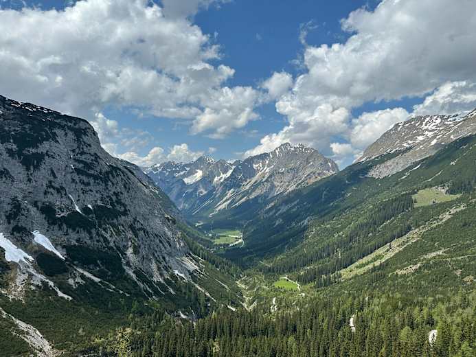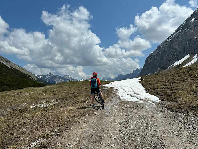 Vom Karwendelhaus fährt man ein Stück des Weges retour und auf den Hochalmsattel. Der Blick vom Hochalmsattel in die umliegende Bergwelt ist äußerst beeindrucken. Vom Hochalmsattel fährt man zum kleinen Ahornboden – der Weg ist teilweise steinig, steil und mit schottrig. Dennoch bietet er keine nennenswerten Schwierigkeiten.