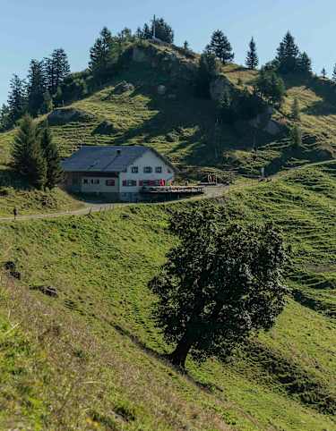 Unter dem Gipfel lädt die Hirschberghütte zum Verweilen ein.
