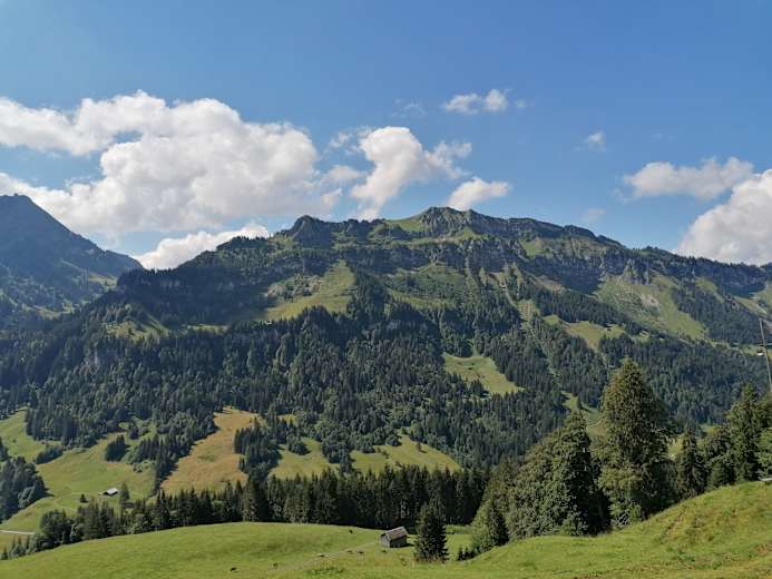 Von Schnepfau radelt man zunächst entlang der Straße bis hinauf zur Schnepfegg. Hier beginnt ein langer Güterweg, der sich über die Hirschbergalpen bis zum Hirschbergsattel erstreckt. Das sind ca. 10,3 Kilometer und 890 Höhenmeter.