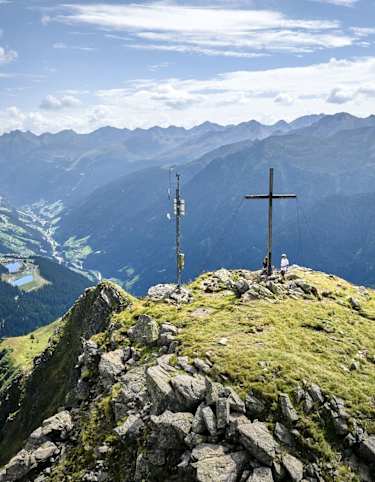 Die Route startet beim Infobüro im Dorfzentrum von Galtür. Folge mit dem Bike dem Fahrweg Richtung Jamtal. In moderater Steigung geht es umgeben von malerischer Natur stetig bergauf. Mit Blick auf den Jamtalferner fährt man auf dem Fahrweg tiefer ins Tal hinein. Am Wegesrand gibt es die folgenden Einkehrmöglichkeiten: Menta Alm (1.657 m) & Scheiben Alm auf knapp über 1.800 m. Auch die Jamtalhütte (2.164 m) eignet sich perfekt für eine kleine Rast, zum Beispiel auf der großen Sonnenterrasse. An der Hütte wird das Bike abgestellt und die Wanderung auf Breite Krone (3.079 m), Grenzeckkopf (3.047 m) und Bischofspitze (3.029 m) beginnt. Gehe Richtung Osten dem Futschölbach taleinwärts nach und folge anschließend der Beschilderung Richtung Kronenjoch (2.974 m). Von hier aus sind es nur noch wenige Höhenmeter bis zu den drei Dreitausendergipfeln.
