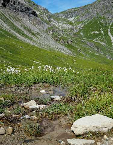 Im Europaschutzgebiet Verwall liegt der Wiegensee, ein natürlicher Stausee im Montafon, auf 1.925 Metern. Per Bike führt die erste leichte Etappe ab Galtür im Paznauntal bis zum Alpengasthof Zeinisjoch auf ca. 2.000 Meter und ab hier zu Fuß zur Verbelle Alpe und zur einzigartigen Hochmoorlandschaft mit dem Wiegensee.