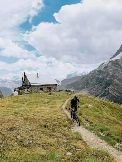 Die Schönbielhütte auf 2.694 m auf der Nordseite des berühmten Matterhorns im Wallis ist auch mit dem Mountainbike zu erreichen. Dafür nimmt man am besten den Matterhorn-Express von Zermatt bis zum Schwarzsee. Anfangs fährt man gemütlich auf Kies, später wird der Trail durchaus anspruchsvoll, ehe man die Hütte des Schweizer Alpenclubs auf 2.694 m erreicht.