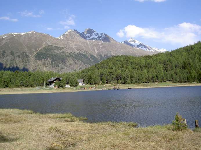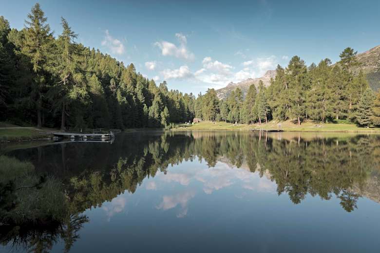Nach wenigen Hundert Metern zweigt die Alpstrasse rechts hoch zur Alp da Staz. Der Aufstieg ist steil, aber die Ebene der Alp Staz ist die Mühe wert. Der Route 627 folgend kommen Sie an den Lej da Staz mit Bademöglichkeiten und Grillplätzen. Gemütlich auf der Naturstrasse und an Hochmooren vorbei wird wieder der Ausgangspunkt erreicht.