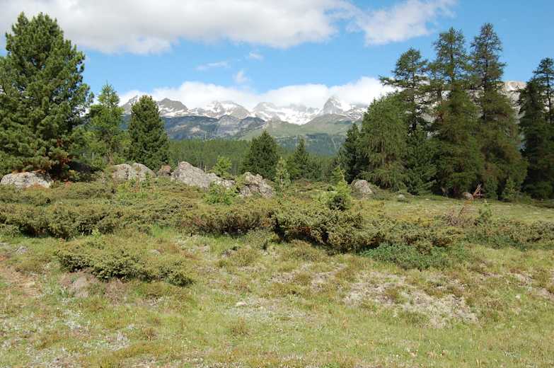 Vorbei an den ersten Häusern von Surlej, steigt die Strasse hoch zum Hochmoor Palüd Lungia und weiter an den Lej Zuppò. Rechts haltend durch den Wald und runter bis wieder fast zur Tennishalle, führt die Naturstrasse hinter dem Heilbad entlang und in den Stazerwald hoch.