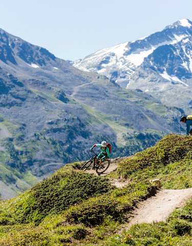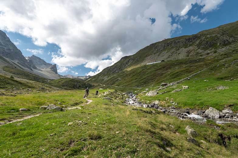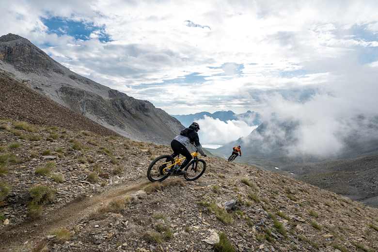 Eigentlich beginnt die Top to Bottom Tour auf dem Piz Nair. Das Bike bei der Bergstation der Luftseilbahn Piz Nair stehen lassen und die gut 30 Höhenmeter zum Gipfel zu Fuss bewältigen, dann aufs Bike und ab geht's! Zuerst auf dem Piz Nair Trail, dann rechts rüber über den Fuorcla Schlattain Trail auf die Fuorcla Schlattain.