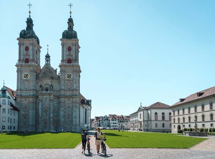 Mit dem Zug bis zum Bahnhof St.Gallen und weiter mit dem Fahrrad oder zu Fuss zum Stiftsbezirk.