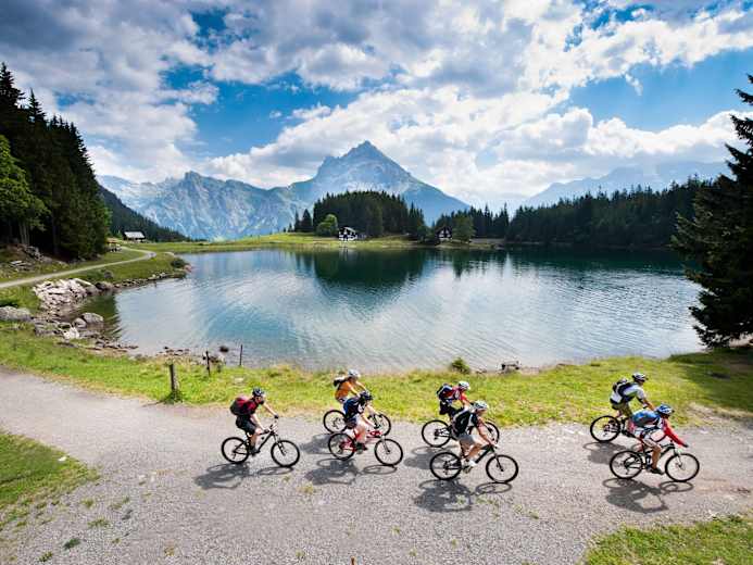 Die Weiterfahrt führt über eine schöne Waldstrasse an den malerischen Arnisee, der mit Picknickplätzen, Feuerstellen und Restaurants die Möglichkeit zur Mittagspause bietet. Die Abfahrt auf dem etwas steilen, ruppigen Alpweg fordert Bremsen und Federung, wird aber jedes Bikerherz erwärmen.