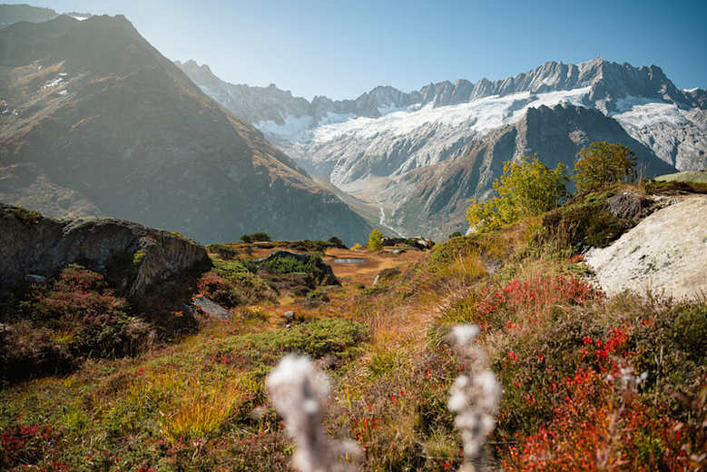 Die Sicht auf Göscheneralpsee, Gletscher und Berge ist fantastisch. Tiefen-, Rhone-, Damma-, Schnee- und Eggstock sind auch im Sommer schneebedeckt.