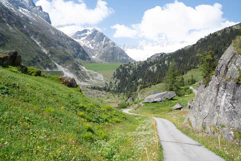 Am Dorfausgang von Göschenen wartet die erste Rampe hinauf bis kurz vor Abfrutt; vor dem Weiler biegt man links auf ein Natursträsschen ab. In Wiggen geht es über die Göschenerreuss zurück auf die asphaltierte Strasse, die durch einige nicht beleuchtete Tunnels führt . Nach einigen Kehren erreicht man den Talkessel beim Campingplatz im Gwüest.
