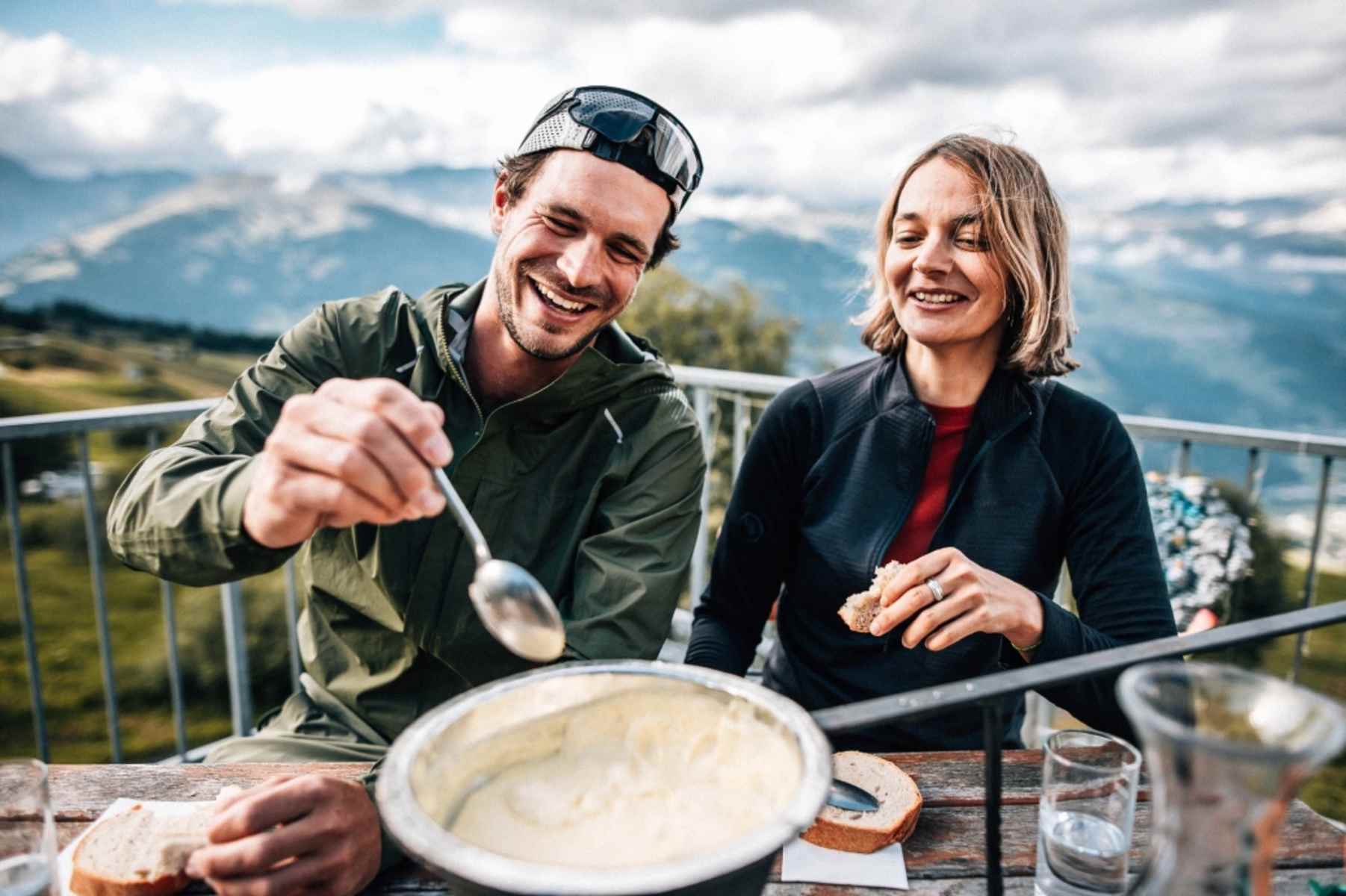 Auf dieser Etappe gehts gleich scharf los. Rund 700 Höhenmeter am Stück werden Ihnen zum Frühstück ab Obersaxen Meierhof serviert. Die Strasse zieht hoch via Miraniga nach Wali. Der nun folgende Streckenabschnitt zur Alp Stavonas ist ein Traum. Auf einer Naturstrasse erreichen Sie den höchsten Punkt des Tages – die Alp Nova auf 2.079 m ü. M. Die Baumgrenze haben Sie schon lange hinter sich gelassen und hier oben scheinen die Uhren ein bisschen langsamer zu ticken. Perfekt für eine Auszeit im Sattel. Die Route führt patgific (gemütlich) weiter zur Alp Sezner. Auf der Abfahrt nach Vignogn geniessen Sie einen einmaligen Ausblick in die Val Lumnezia.