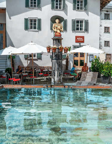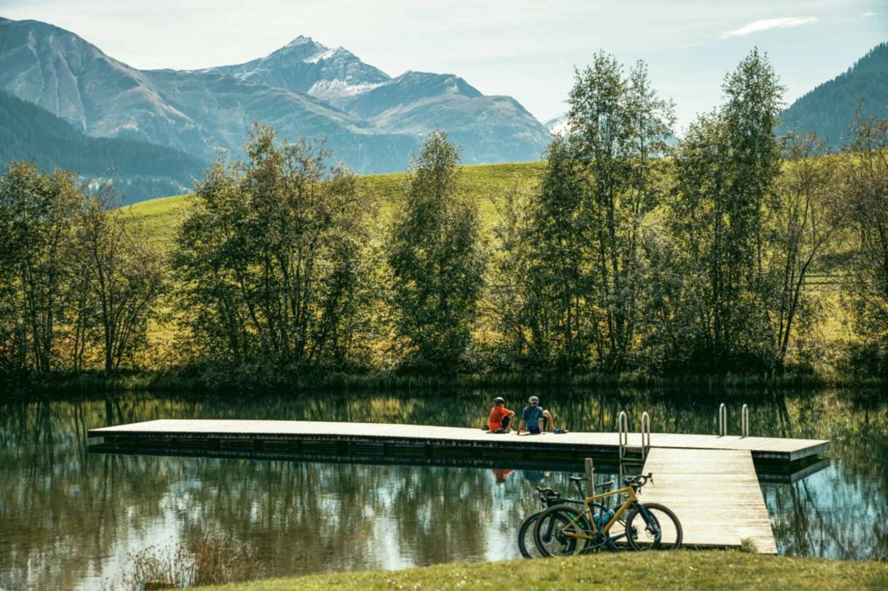 Legen Sie an heißen Tagen beim Badesee Davos Munts eine Pause ein, kühlen Sie Ihre Muskeln und verpflegen Sie sich im Restaurant.