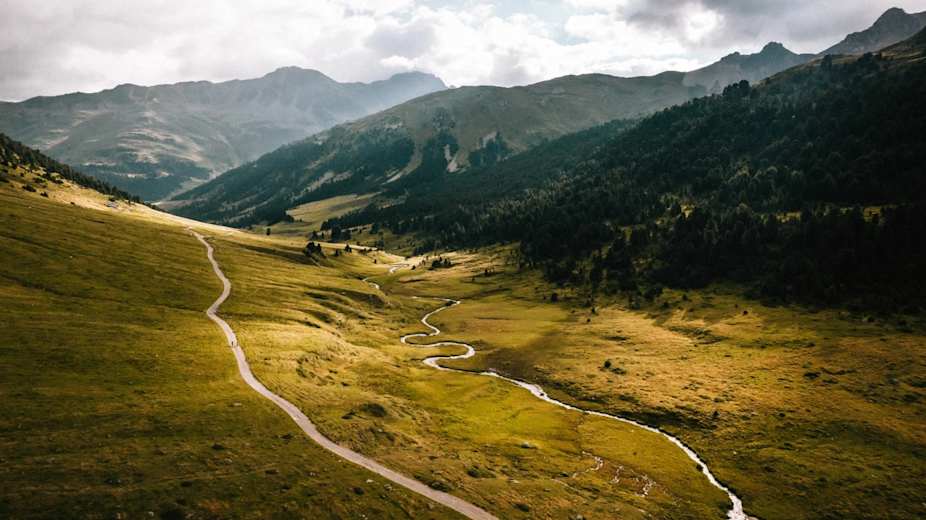 Links der Fluss Clemgia, rechts die feine Schotterstrasse Foto: Tourismus Engadin Scuol Samnaun Val Müstair AG