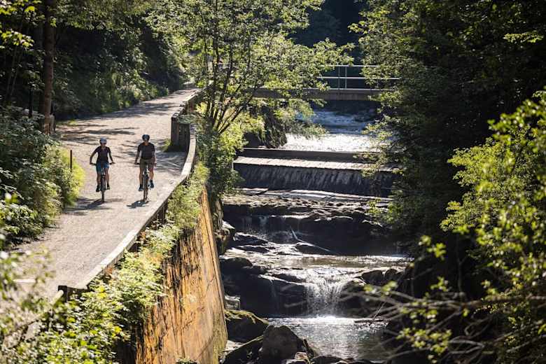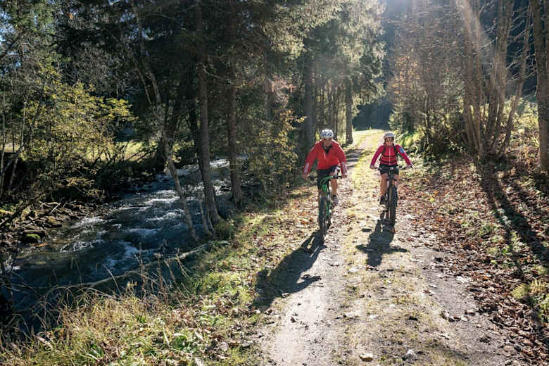 Die Weiterfahrt führt hinunter in Richtung Rohrmoos. Auf der Rohrmooserstraße biegt man rechts ab und kurz darauf, noch vor dem Hotel Erlebniswelt Stocker, links in den Reiterkreuzweg. Dieser gut ausgebaute Schotterweg verläuft in ruhiger Lage durch den Wald und vorbei an schönen Höfen. Anschließend geht es über den Zainerweg ins Preuneggtal, wo man die Strickerbrücke quert und in Richtung Pichl Badesee hinunterfährt.