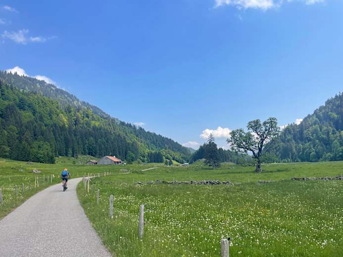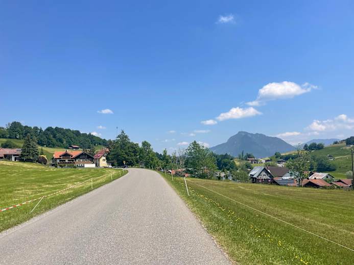 Auf der langen Abfahrt hinunter ins Gunzesrieder Tal heißt es durchschnaufen und genießen. Ein landschaftlich wunderschöner Abschnitt! In Gunzesried angekommen haben wir die Wahl: Entweder weiter auf der Hauptstraße/Radweg nach Blaichach hinunter oder etwas kürzer, dafür mit ein paar Höhenmetern mehr, links ab und über die Weiler Ettensberg und Altmummen Richtung Immenstadt. Wer will, kann bei einer Einkehr im sehr netten Café Zenzimilia über den restlichen Weg nachdenken.