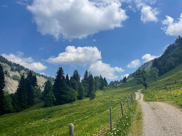Am Anfang nur verkehrsarm, später als Mautstraße, folgt man vorwiegend bergauf dem Alpweg in das idyllische Lecknertal. Wir fahren rechterhand des Leckner Sees vorbei und passieren noch auf Teer die Alpen Neuschwand und Helmingen mit Einkehrmöglichkeit. Dabei genießen wir nach links Ausblicke auf das abwechslungsreiche Massiv der westlichen Nagelfluhkette, rechts des Weges der Blick in die Bergwelt des Bregenzer Vorderwaldes. Dann folgt ein netter Wiesentrail, bevor wir uns auf Schotter und Naturwegen der Sura-Alpe nähern, um bald darauf den höchsten Punkt an der Alpe Scheidwang zu erreichen.