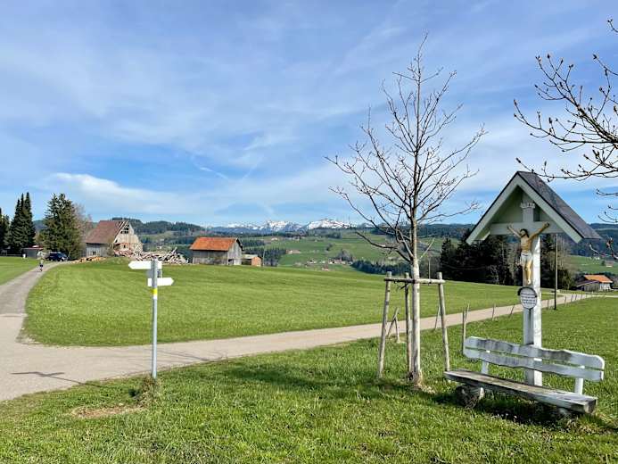 Hier die Wahl: entweder auf demselben – kürzeren – Weg zurück nach Oberstaufen. Wer noch Körner bzw. Akku in Reserve hat, nimmt zusätzlich die Weiterfahrt auf dem ehemaligen Bahndamm nach Oberhäuser in Angriff. Von dort weiter nach Röthenbach. Über einen Wiesen- und Waldweg hinauf nach Schönau und weiter nach Harbatshofen. Über Oberthalhofen, Zell und Buflings zurück nach Oberstaufen.