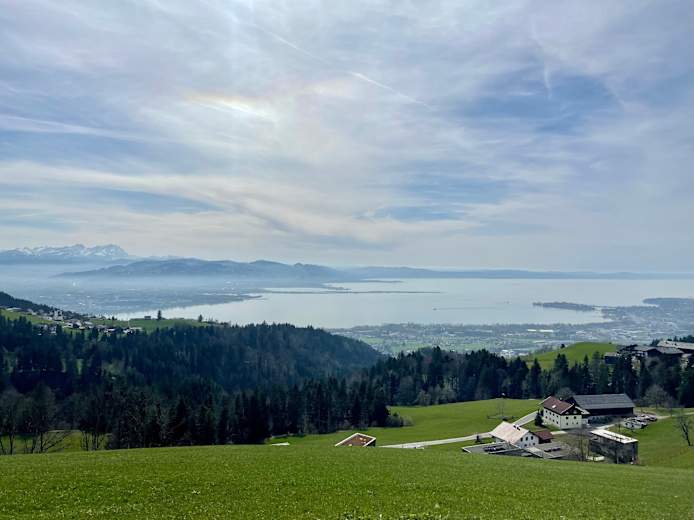 Auf dem Rückweg folgen gleich jede Menge Höhenmeter bergauf, die mit der Hilfe eines E-Motors aber kein Problem sind. Verkehrsfrei fahren wir zunächst in Richtung Gebhardsberg und immer weiter bergauf in den Ortsteil Fluh. Noch einmal heißt es, in die Pedale zu treten und Höhenmeter zu machen, bis endlich die Bergstation der Pfänderbahn ins Blickfeld kommt. Der lange Anstieg wird immer wieder von fantastischen Panoramablicken in die Schweizer Berge, über den Bodensee, in Richtung Vorarlberger Gipfel sowie auf die Gipfel der Nagelfluhkette belohnt.