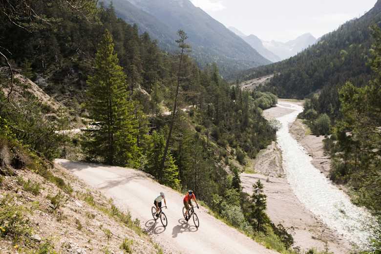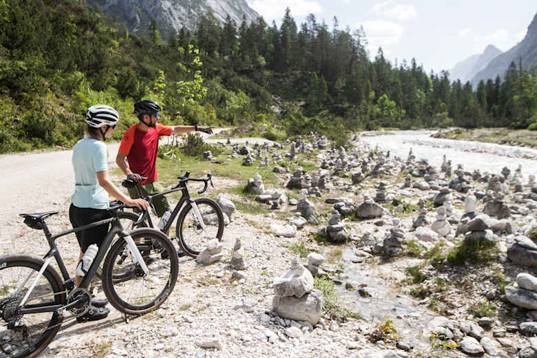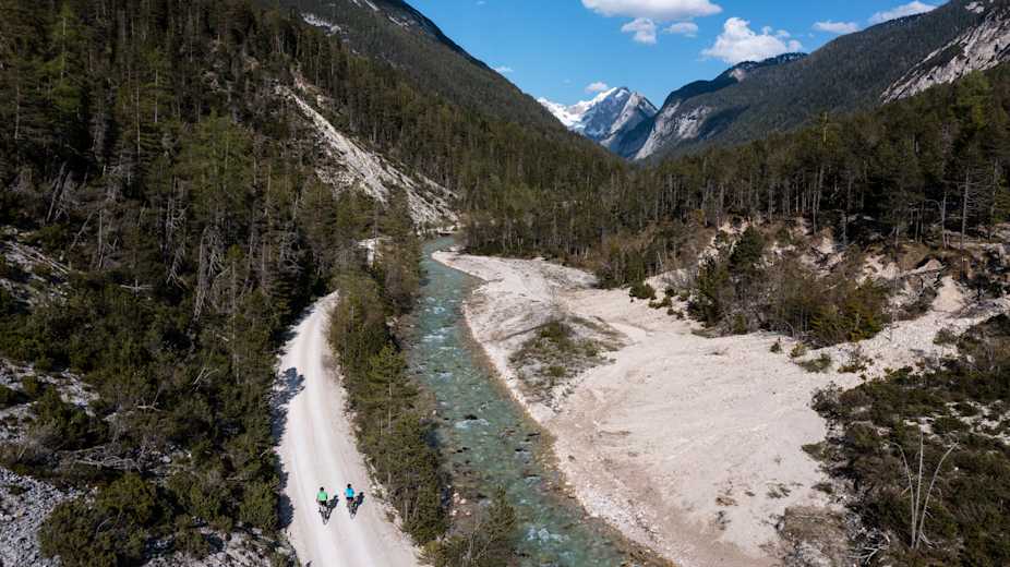 Gravelbiker im Hinterautal - Blick auf die Isar und das KarwendelgebirgeFoto: Florian Breitenberger, Region Seefeld