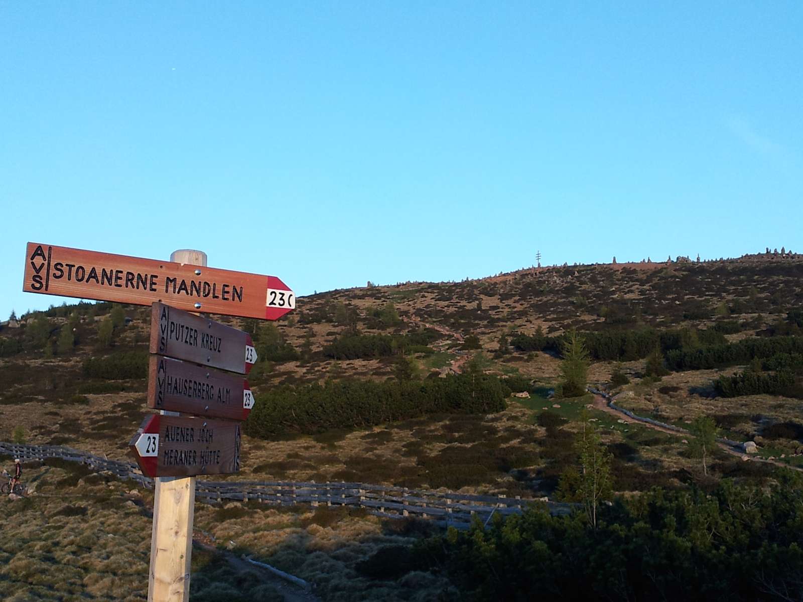 Nach der Auener Alm geht der Weg weiter zum Auener Jöchl, das seit kurzem sehr gut befahrbar ist. Nun sieht man schon die Beschilderung Stoanerne Mandlen.