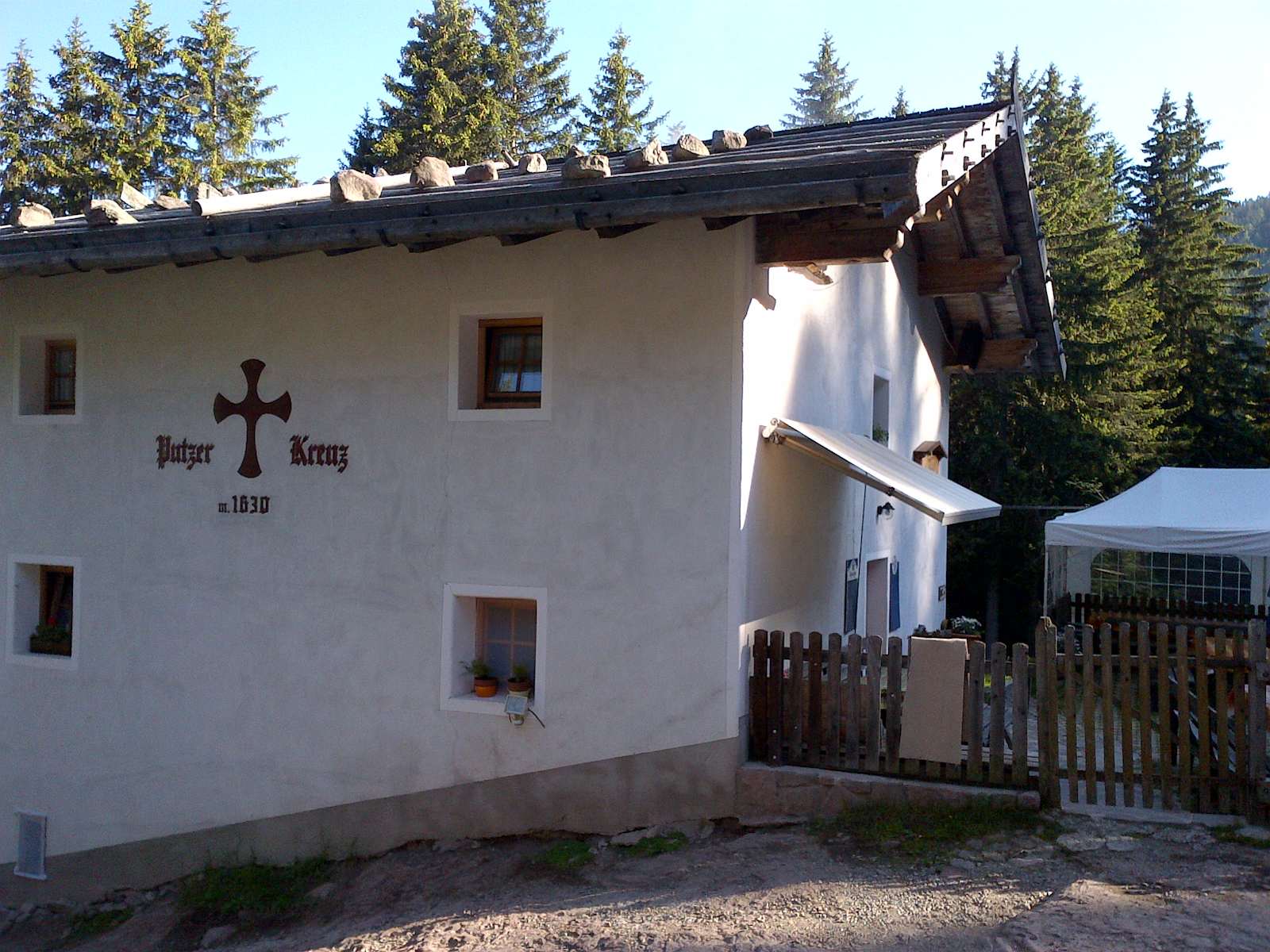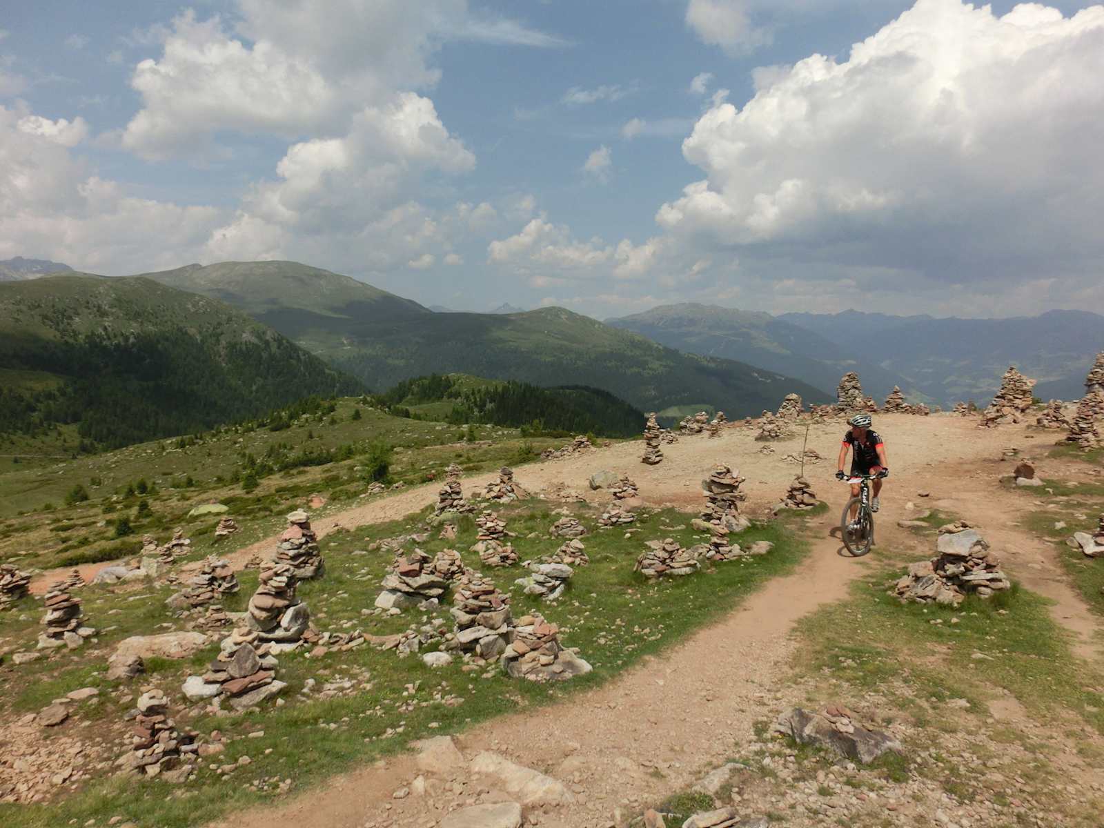 Über die wunderbaren von Enzian, Almrosen und anderen Almblumen bedecken Putzer Wiesen gelangt man nun zum Almgasthaus Putzer Kreuz. Von dort führt zuerst ein Almweg und dann eine geniale Trailabfahrt über den alten Kreuzweg nach Putzen (Markierung Nr. 5) an den Ausgangspunkt in Sarnthein zurück.