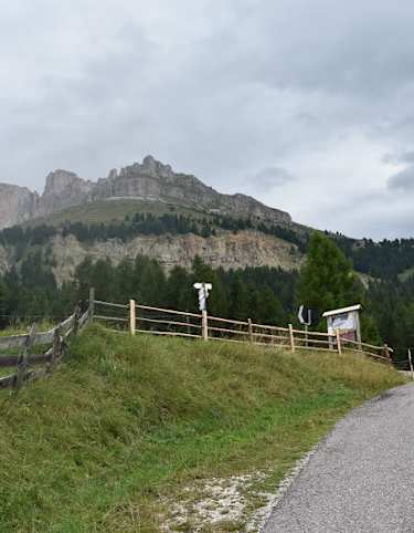 Dem Forstweg folgt man bis zum Gasthof Da Plenta und radelt talwärts auf der asphaltierten Straße weiter bis zur Einmündung in die SS 355, wo man wieder auf die Aufstiegsroute trifft, der man bis nach Campolongo folgt.