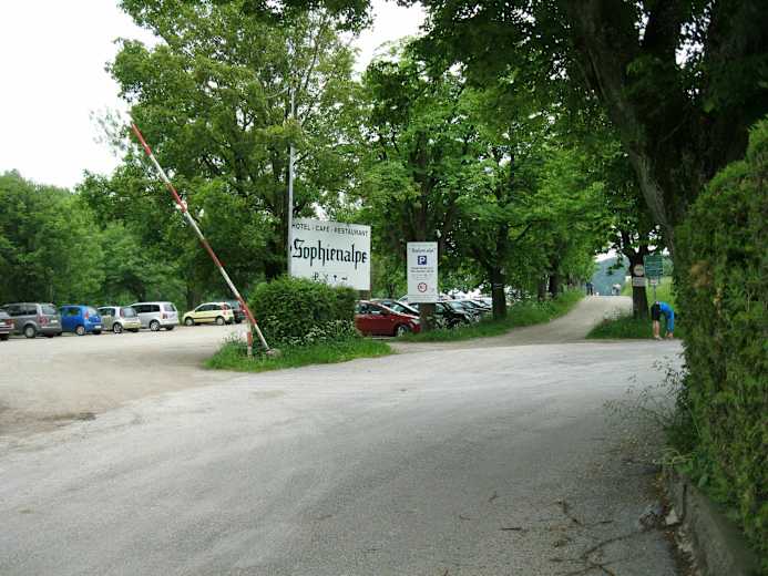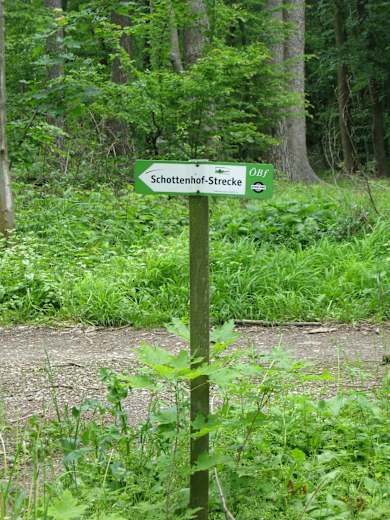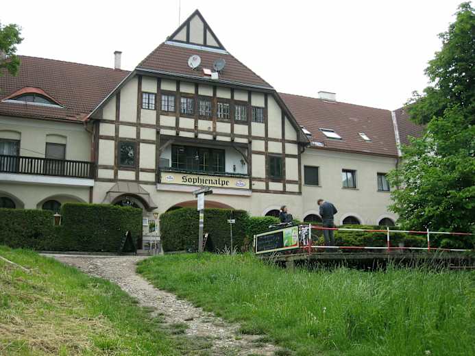 Von der Warte fährt man ein paar Höhenmeter entlang der angrenzenden Wiese in Richtung Osten hinunter und biegt in den breiten Wanderweg ein, der leicht abfallend bis zur Kreuzeichenwiese führt. Dort zweigt man links in Richtung Schottenhof ab, den man nach einigen Hundert Metern erreicht. Man überquert die Amundsenstraße und fährt links vom Schottenhof auf den Forstweg auf. Nach einigen Hundert Metern kommt man an eine Kreuzung, hier geht es rechts weiter in Richtung Sophienalpe.