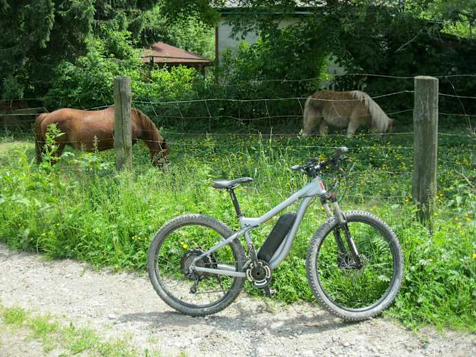 Alternativ kann man auch links abbiegen und den Forstweg zur Riegerhütte hinunterrollen. Beim dort ansässigen Reiterhof kann man stets einige Haflinger auf der Weide beobachten. Von der Karl-Bekehrty-Straße kommt man auf einfachem Weg hinauf zum Verbindungsweg zwischen Sophienalpe und Mostalm: Man biegt gegenüber des Hauses Karl-Bekehrty-Straße 19 auf die Schotterstraße ab und radelt hinauf bis zur Franz-Karl-Fernsicht am Kamm.