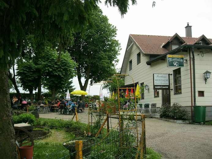 Das Bergrestaurant Sophienalpe bietet sich als erste Einkehrmöglichkeit an: Das Gebäude stammt aus der Zeit der vorletzten Jahrhundertwende. Wer dem Titel dieser Mountainbiketour aber wirklich gerecht werden will, spart sich seinen Appetit bis zur Mostalm auf. Der geschotterte Weg dorthin zweigt vom Parkplatz der Sophienalpe in Richtung Südwesten ab und führt entlang weitläufiger (Alm-)Wiesen und durch ein kurzes Waldstück direkt auf die Mostalm.