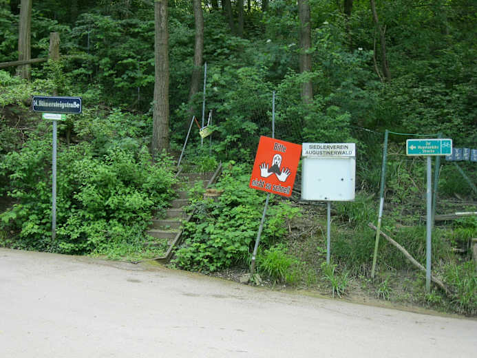 Die nächste Etappe beginnt entlang der Almwiese und führt in Richtung Westen. An deren Ende gabelt sich der Wanderweg, man zweigt rechts in Richtung Hohe-Wand-Wiese ab, die man nach ein paar Minuten erreicht. Auf einem steilen Single-Trail geht es in Falllinie entlang der Hohen-Wand-Wiese bergab, bis man in die Mauerbachstraße einmündet. Man überquert die Straße, biegt sofort rechts in die Seitenstraße ein und überquert den Mauerbach. Auf der Asphaltstraße geht es steil bergauf: Man folgt den Schildern ‚Mountainbikestrecke’, bis man am höchsten Punkt des Augustinerwaldes angelangt ist.