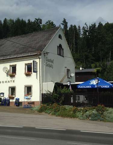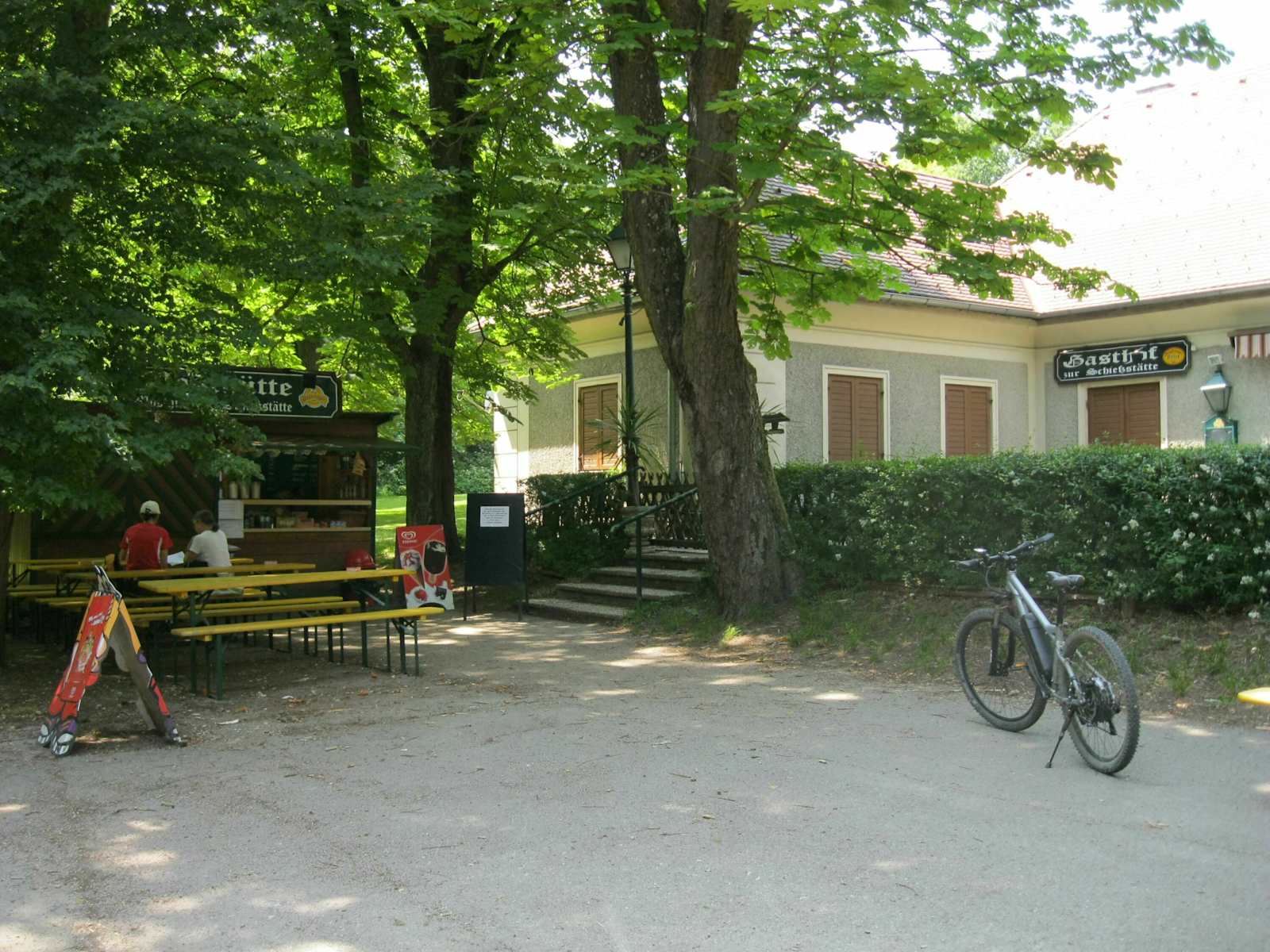 Über die Modl-Toman-Gasse erreicht man die Wittgensteinstraße, die steil hinauf zum Parkplatz beim Schranken führt. An der Tiergartenmauer sind ab hier in maßstabsgetreuen Abständen Planeten-Symbole auf Info-Tafeln zu sehen, welche die Größen- und Distanzverhältnisse in unserem Sonnensystem veranschaulichen. Man fährt an Sonne, Merkur, Venus, Erde und Mars vorbei und zweigt beim Hinweisschild zum Gasthaus Schießstätte nach links von der Mauer ab. Nach ca. 250 m hat man, vorbei an der BMX-Strecke rechts im Wald, dieses Gasthaus auch schon erreicht.